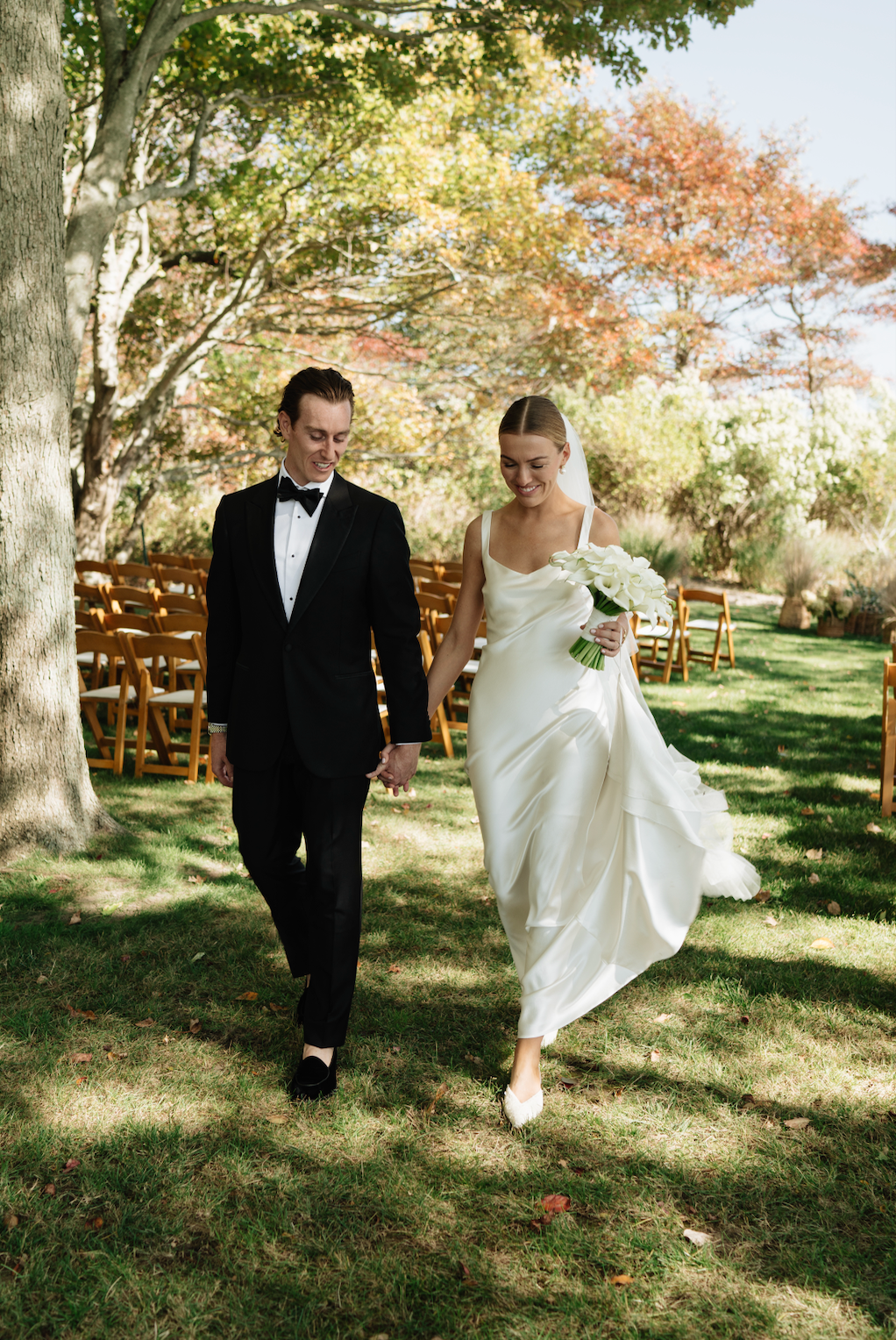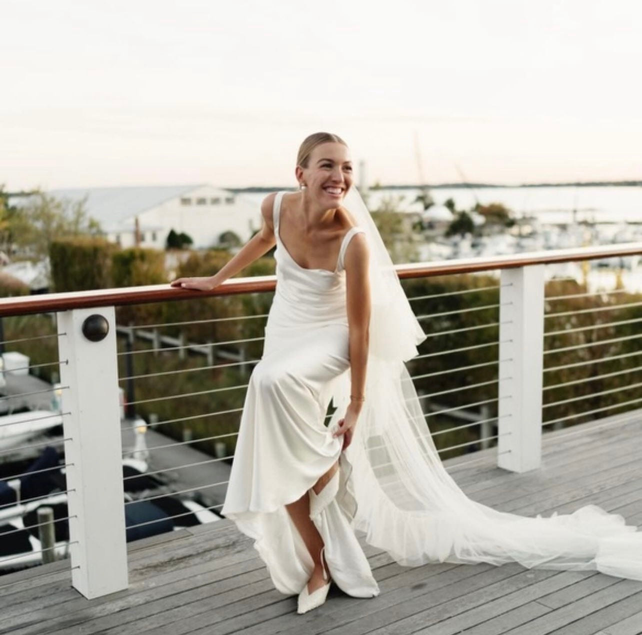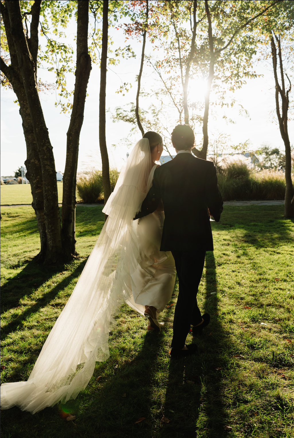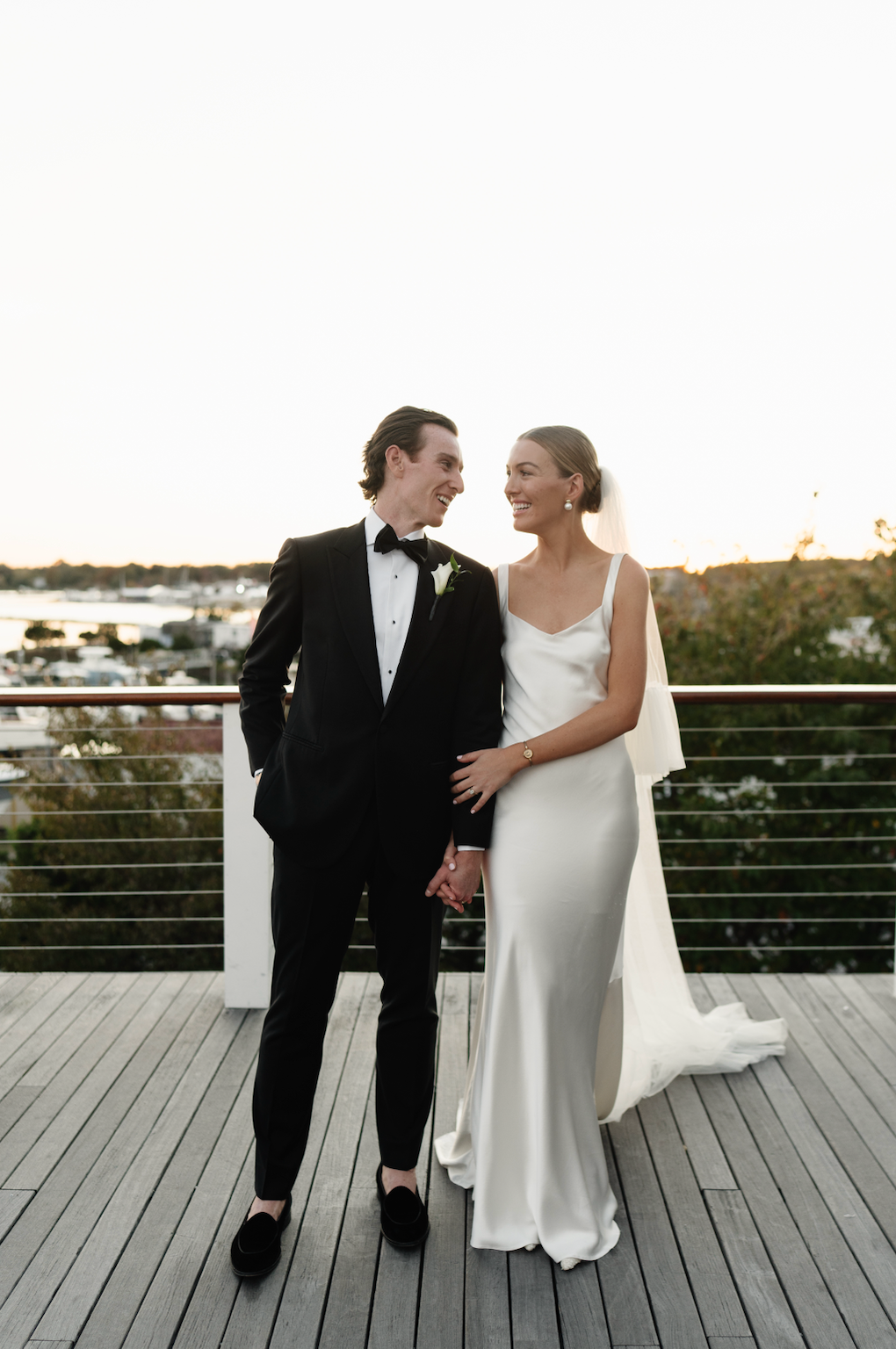 We love the old world timeless feel of Cat and Connor's gorgeous wedding at the Picnic Bay Yacht Club in New York. Cat was inspired by Carolyn Bessette Kennedy's timeless style and so there was only one gown for her. She wears STYLE 008, the gown inspired by Carolyn's iconic 90s wedding dress. Beautifully styled with STYLE 102 our flounce veil and a pair of NEOUS pumps.