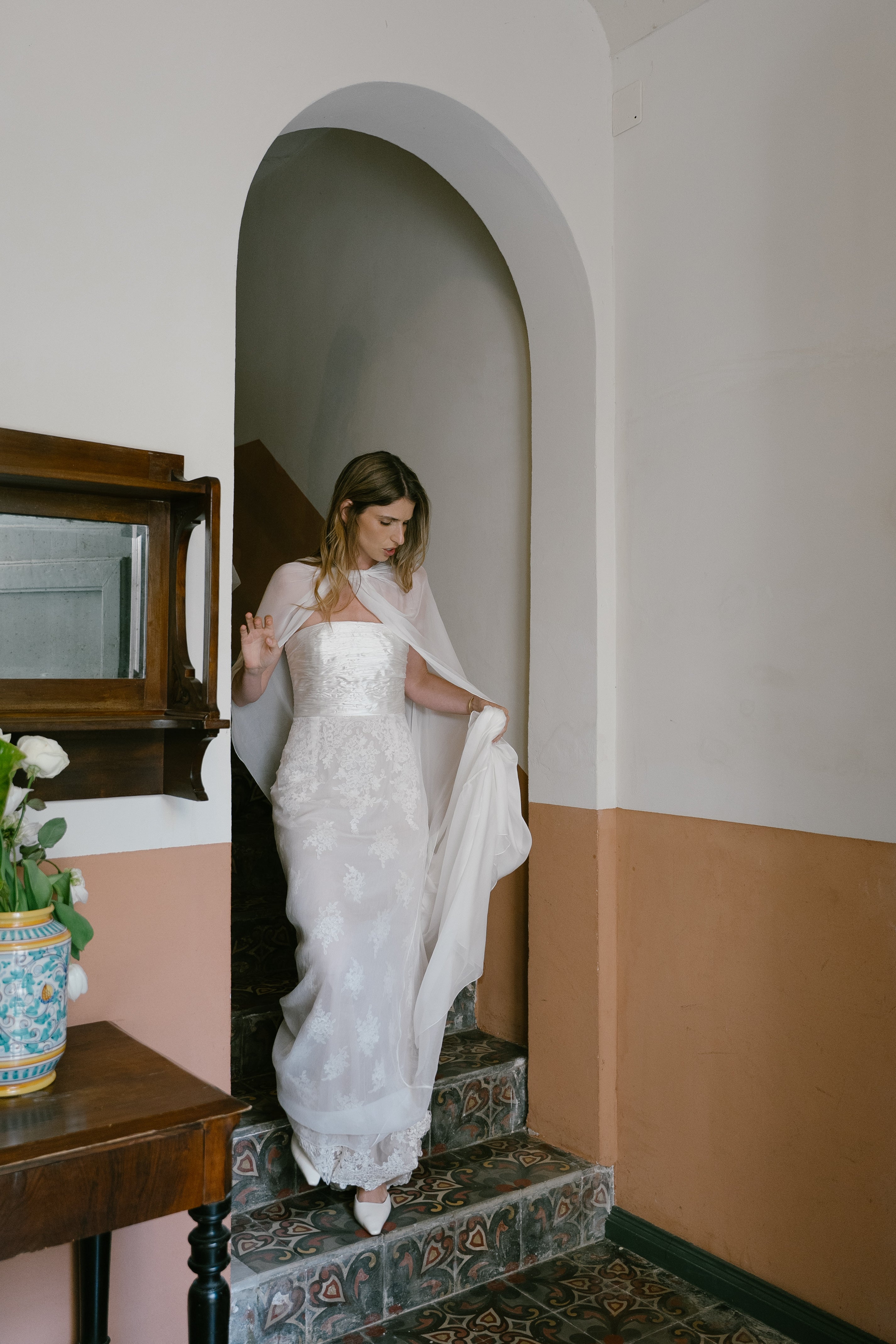 A Sicilian dream ... Natasha wears STYLE 130, our crushed silk and lace gown, styled with our silk chiffon cape, STYLE 037.