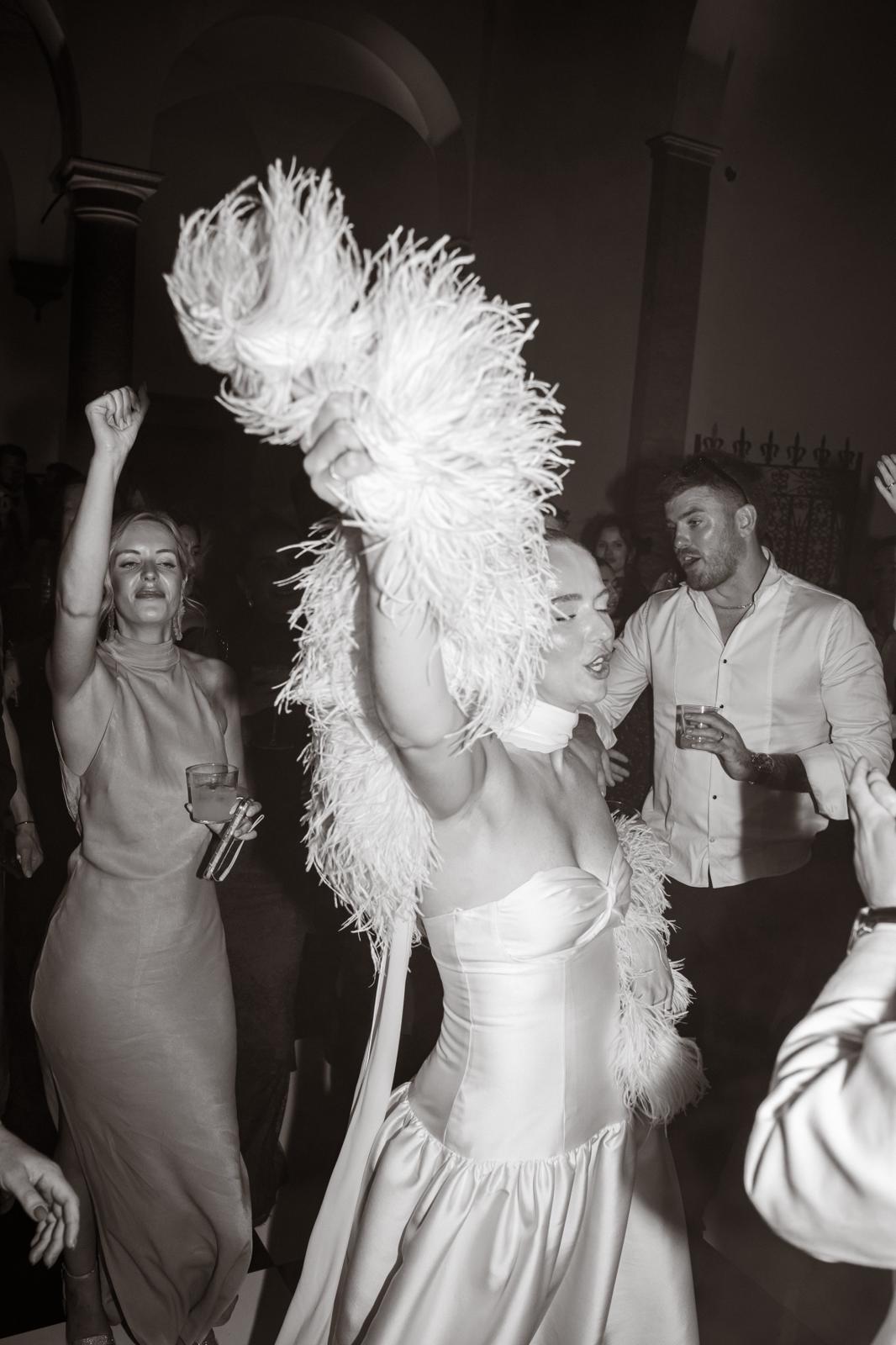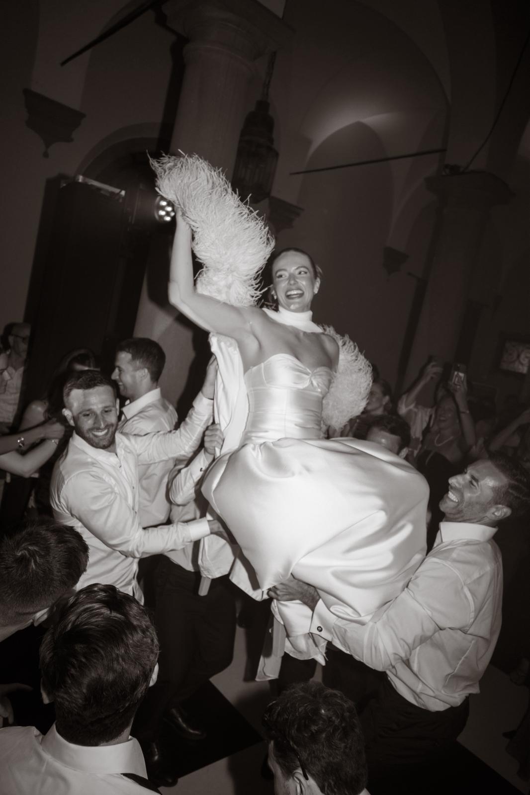 Olivia wore bespoke OWN - a corseted lace gown with delicate puff sleeves, a demi drop waist and a dramatic train. We worked with the beautiful Olivia over a number of months to develop this intricate piece; from a series of sketches to carefully choosing the perfect lace from our fabric library, to hours of meticulous hand needlework that went in to finishing the dress.