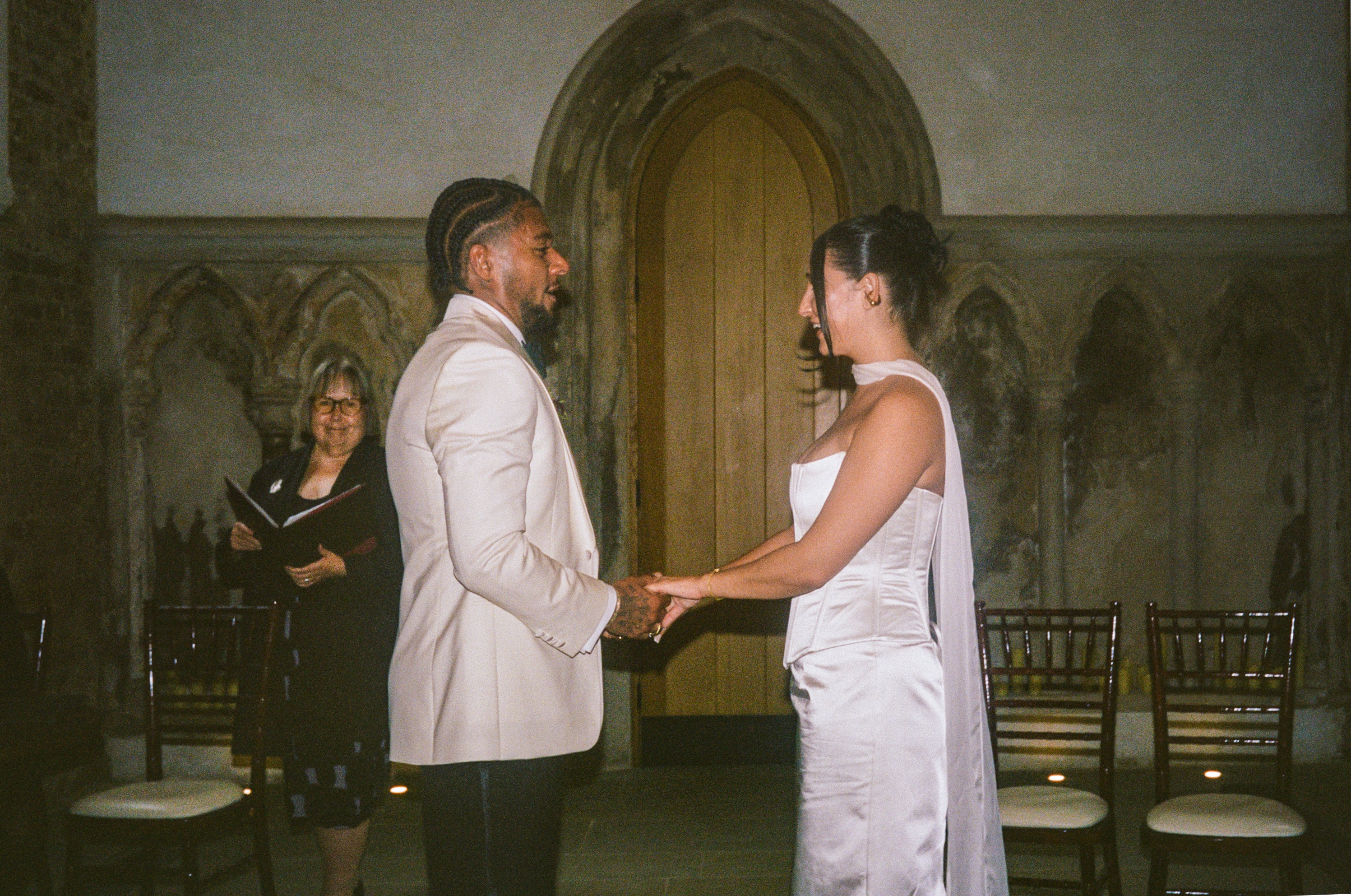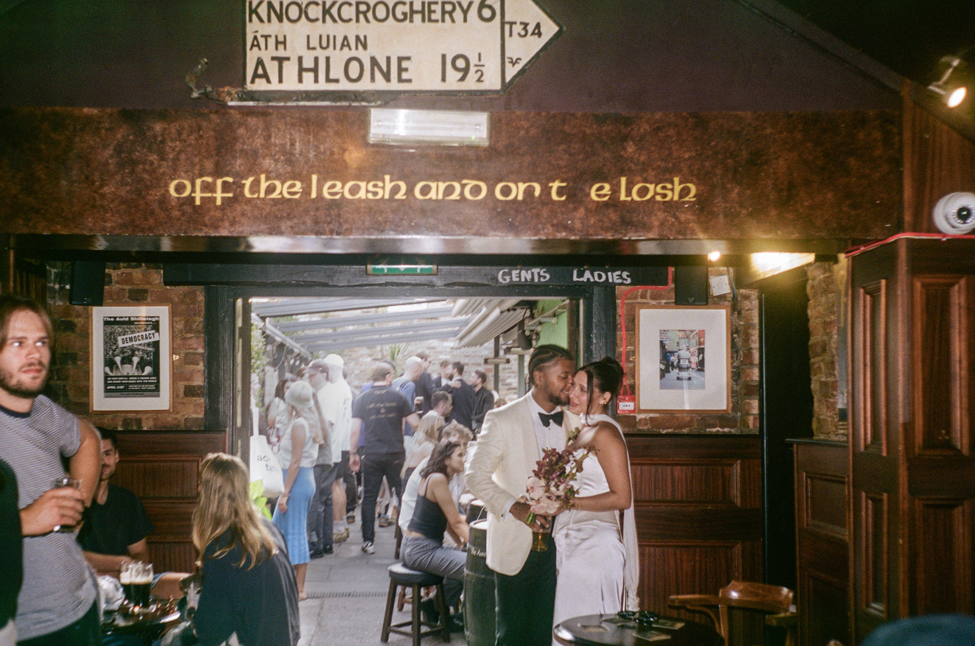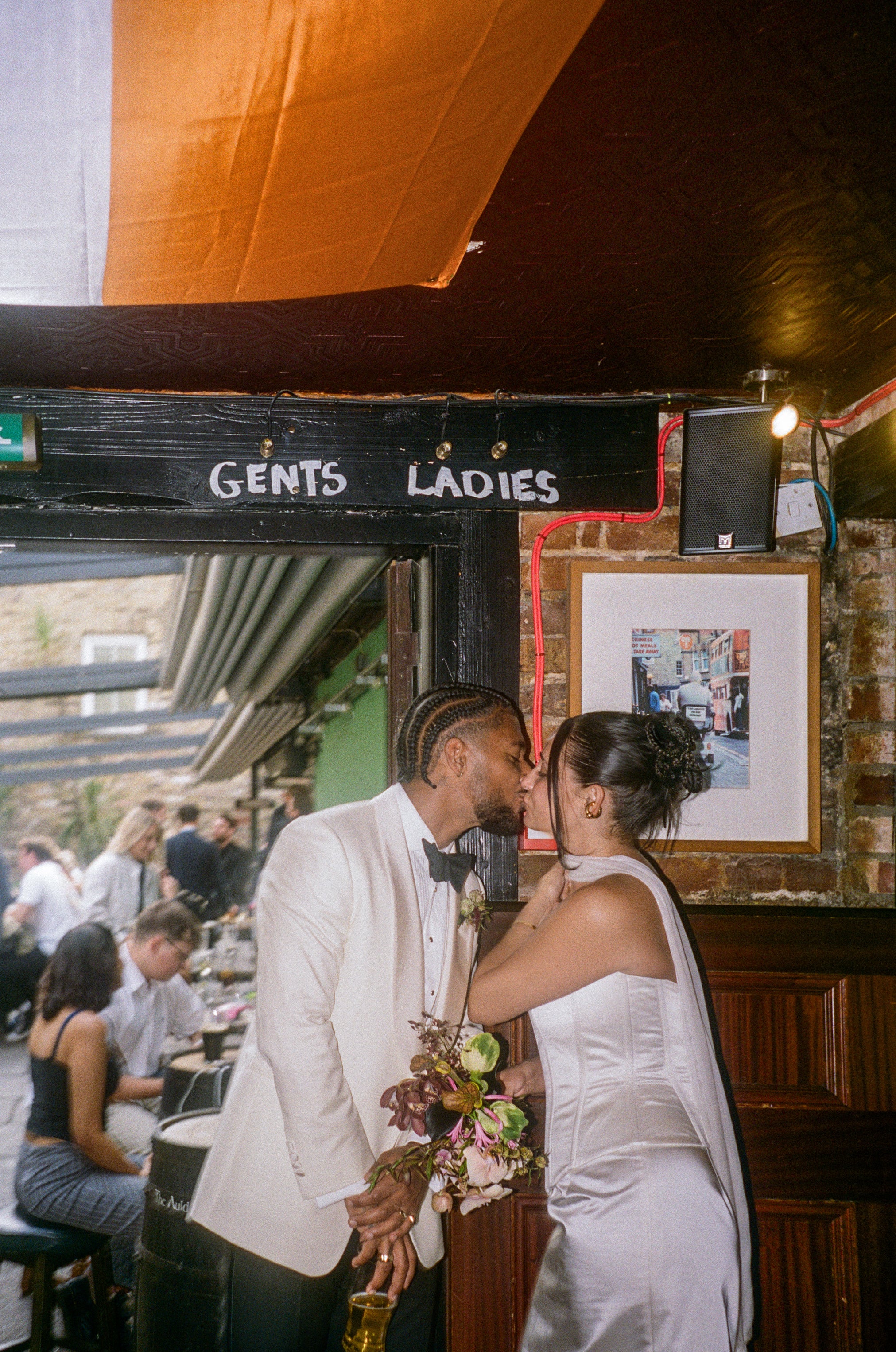 Kate says, “We had our intimate civil ceremony at Abney Park Chapel in Stoke Newington, then headed to The Auld Shillelagh for Guinness and champagne before making our way to Tom’s Pasta for a big family-style lunch of lasagne and tiramisu. We really wanted a laid-back vibe to the day, nothing too formal and it was so special. I always knew I wanted to incorporate some pieces from my glassware brand into the day, so I created vases and pinch pots to complement our floral colour palette.