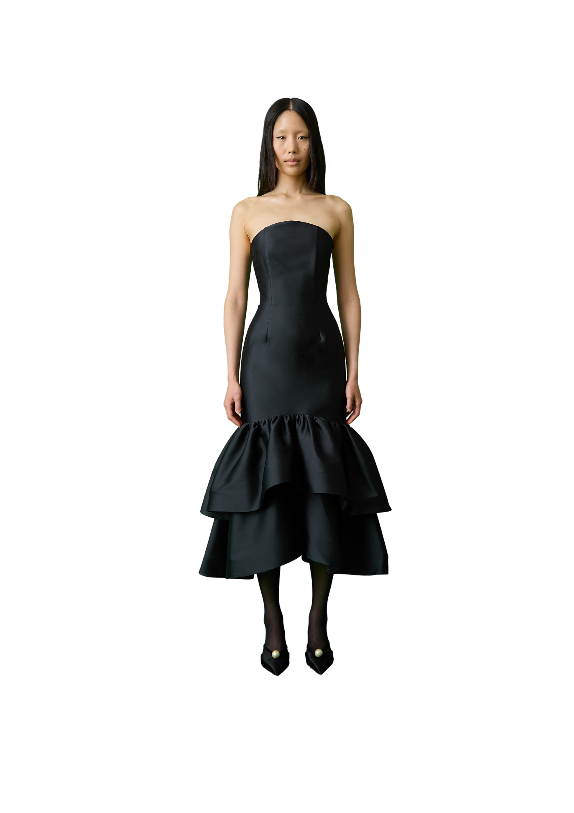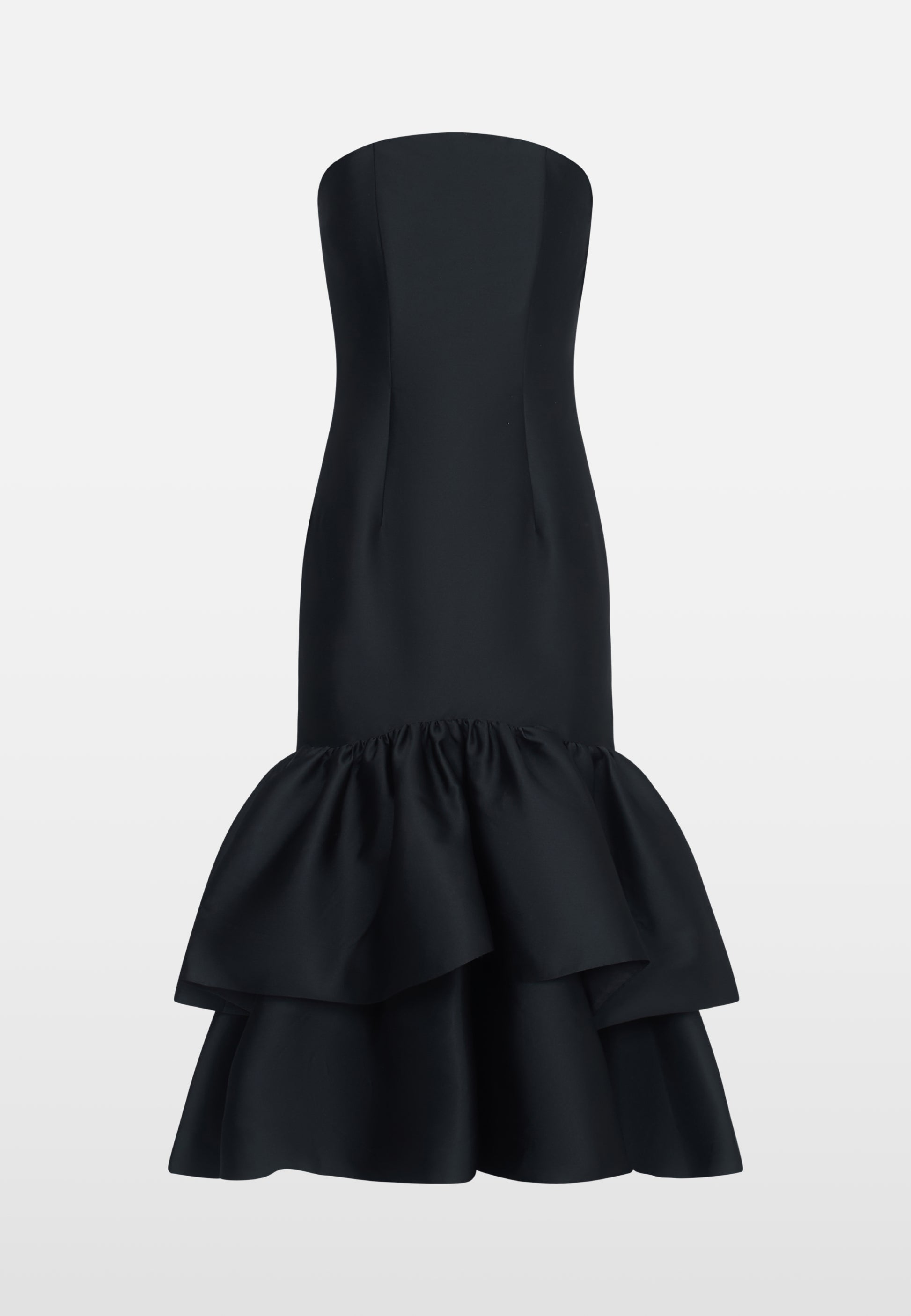 A modern take on evening elegance. THE RUFFLE YOUR FEATHERS gown is cut from structured black mikado to create a sculpted bodice that skims the body before releasing into a dramatic double-tiered ruffle hem. The strapless soft crescent neckline is clean and minimal, allowing the architectural volume of the skirt to take focus. Designed to hit mid-calf, the cascading ruffles move fluidly as you walk, bringing a sense of playful drama to this sleek silhouette.