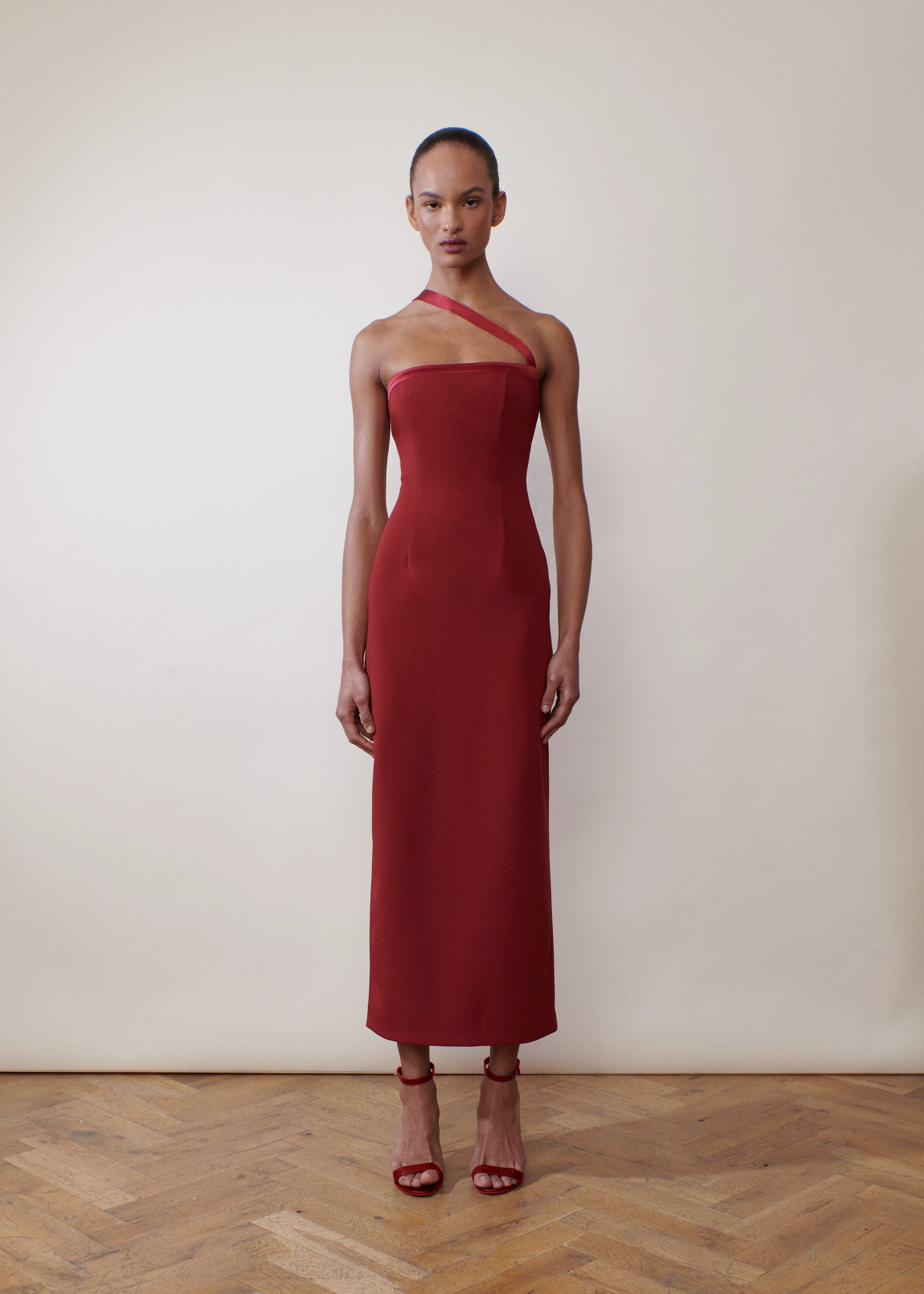 A strapless stretch crepe column finished with an asymmetric strap crafted in a contrast satin.