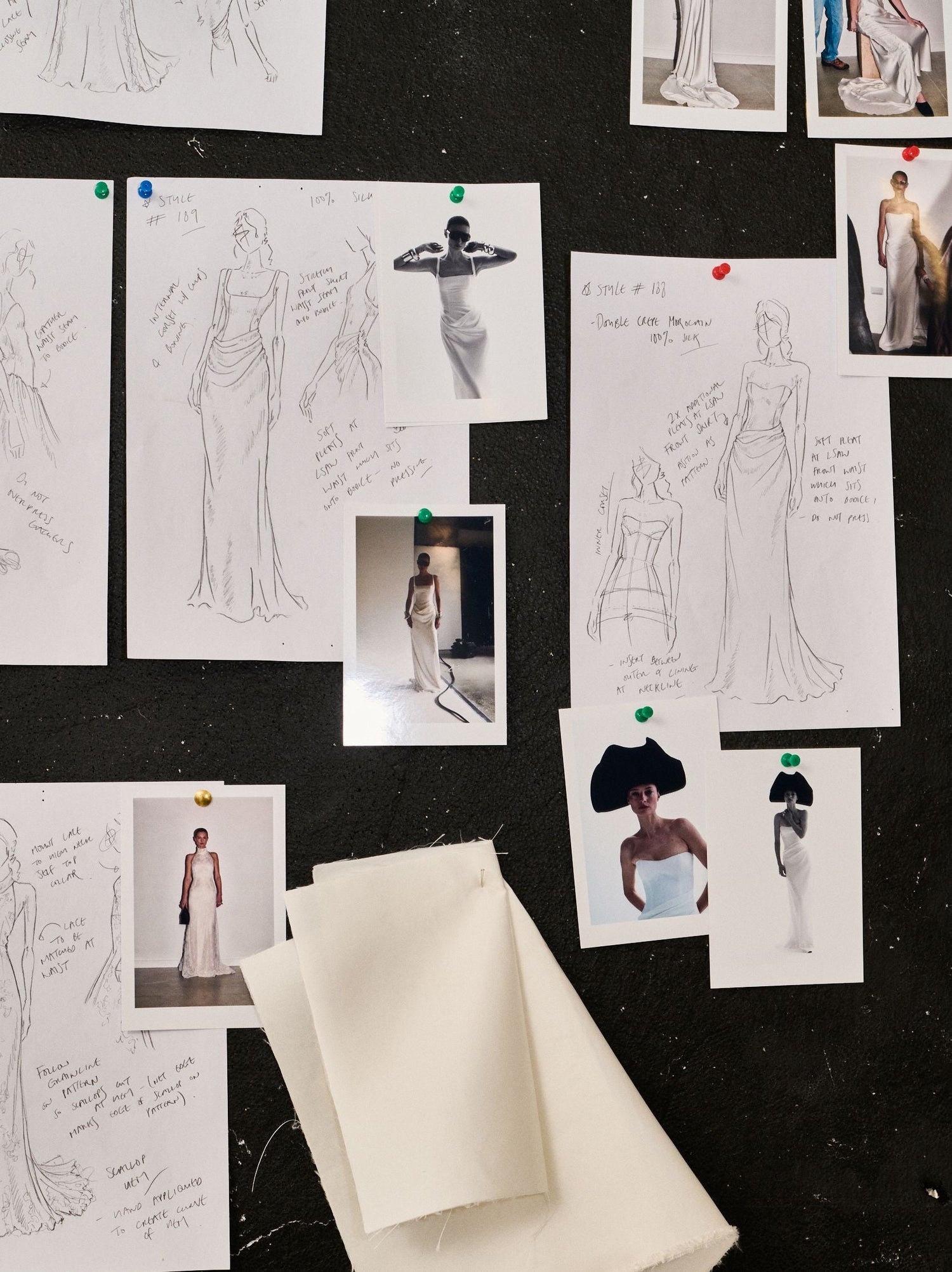 You will have had a pre- consultation where we will have learned all about you, your vision for the wedding and your outfit, so at your first design consultation we’ll explore sketches, references and ideas as well as fabric options, silhouettes, cuts and trimmings, to build a physical vision board of your dream look.