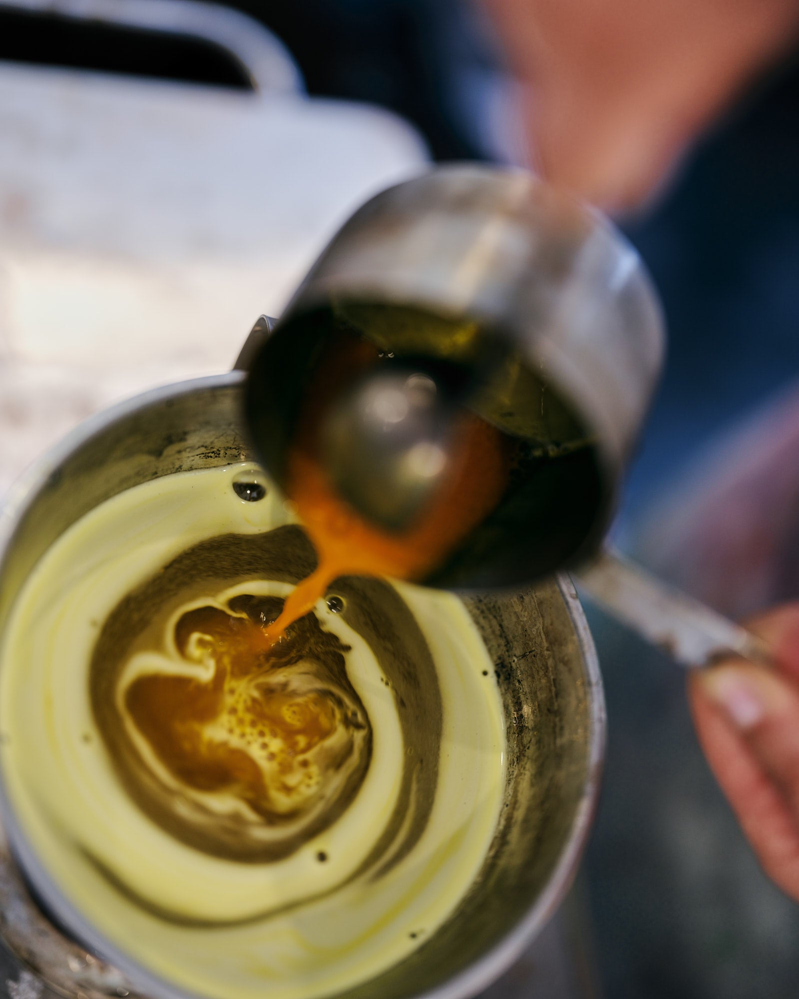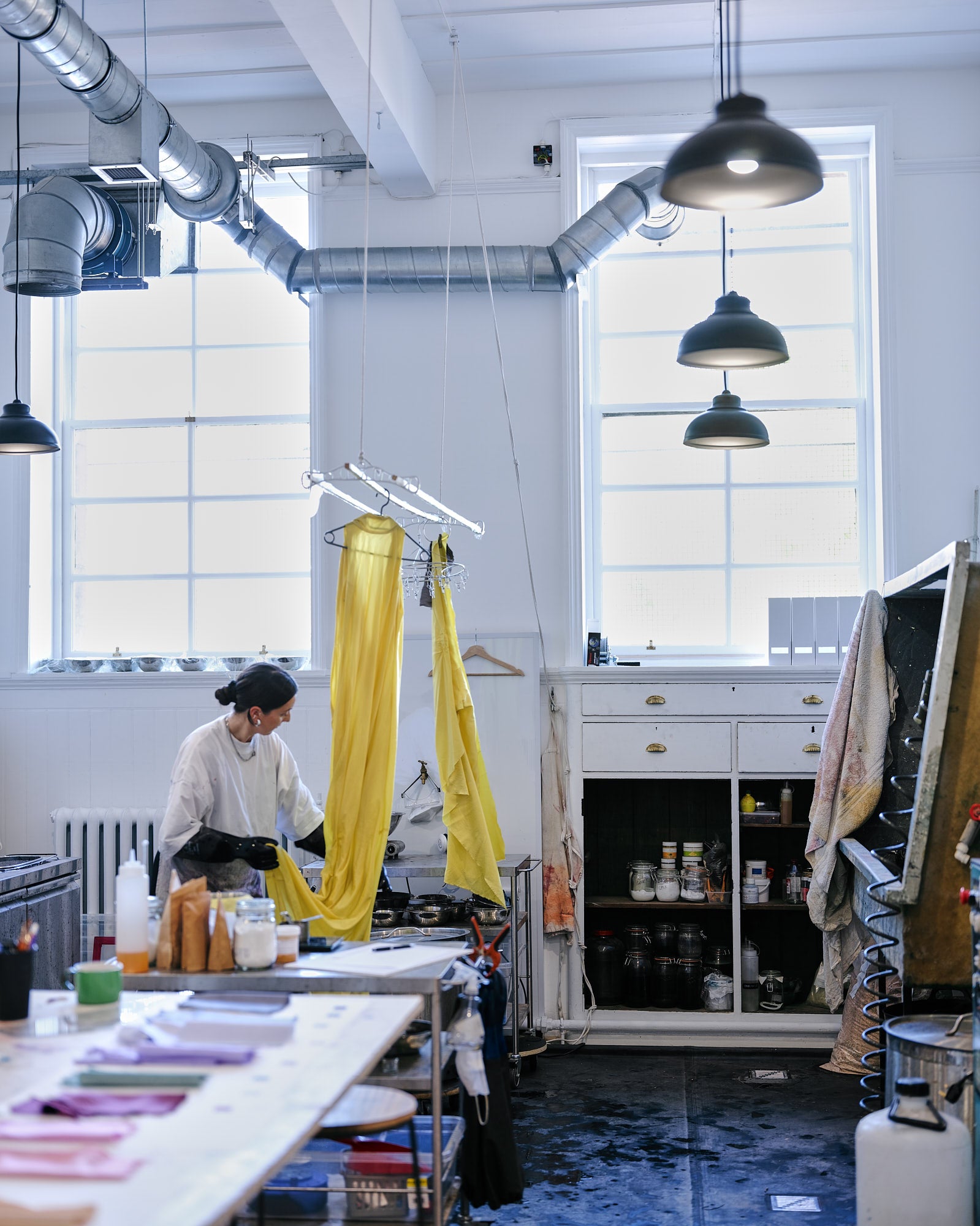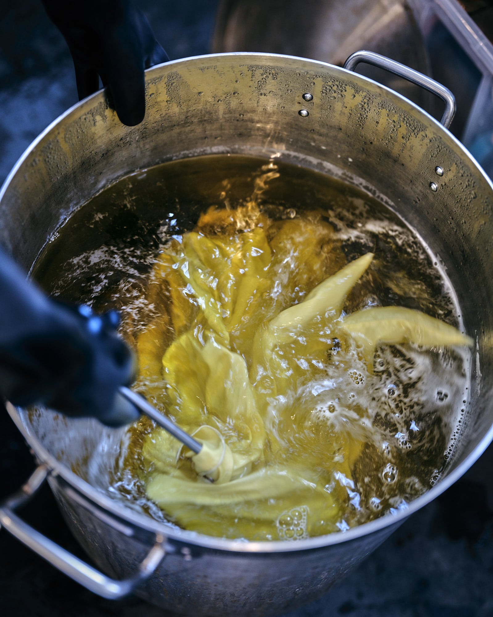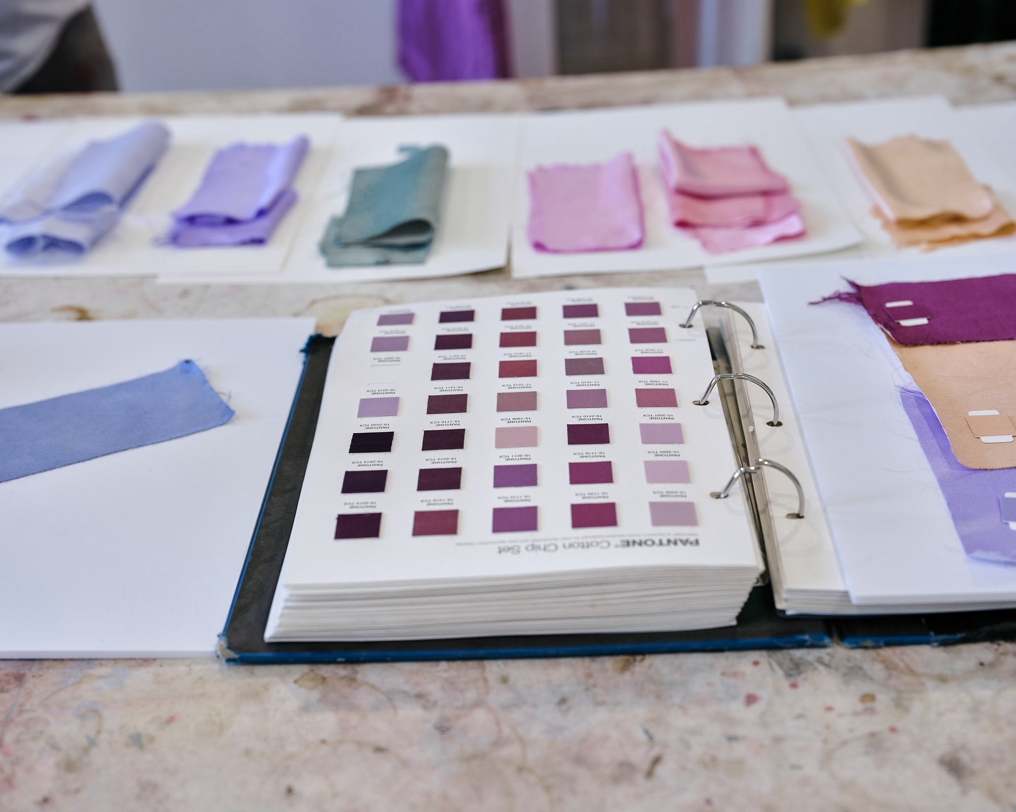 Choose from a stunning palette of colours using our digital swatch book or during a one to one consultation in the studio. Your garment will then be meticulously dyed by hand to create unique and character-rich colours, a process that can take up to two days to complete.