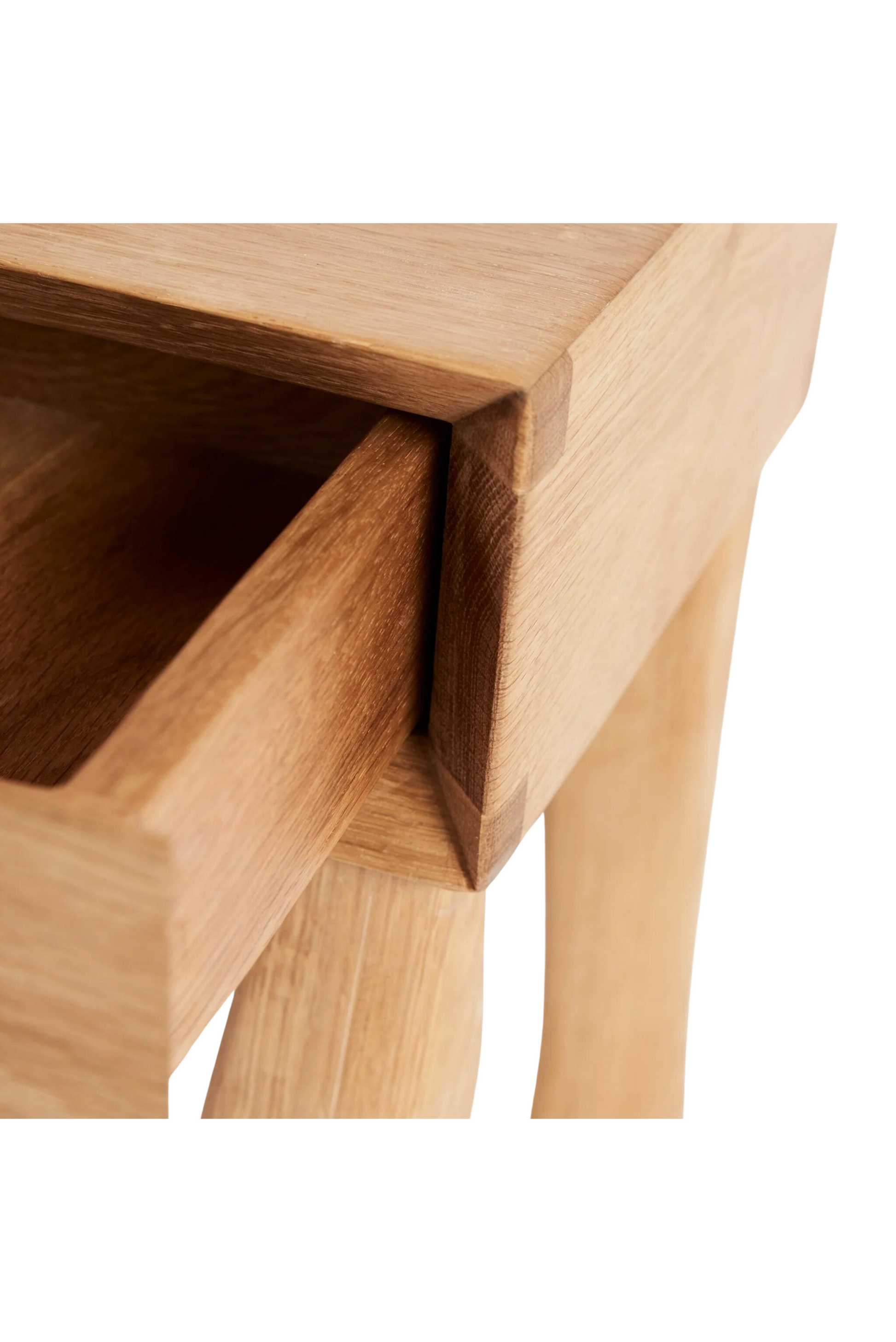 The Foot Side Table is made from Oak wood with carefully designed jointing details. The drawer stands on 4 irregular legs of which one has a foot. The piece is available to order as single and as a pair.