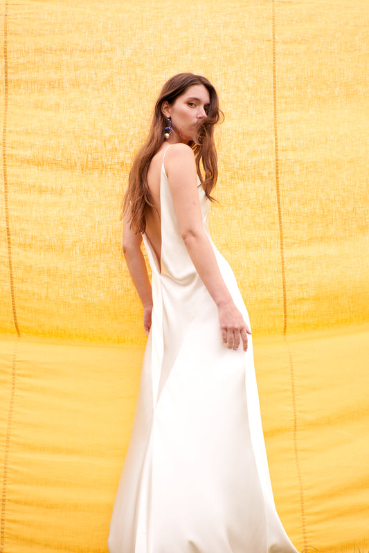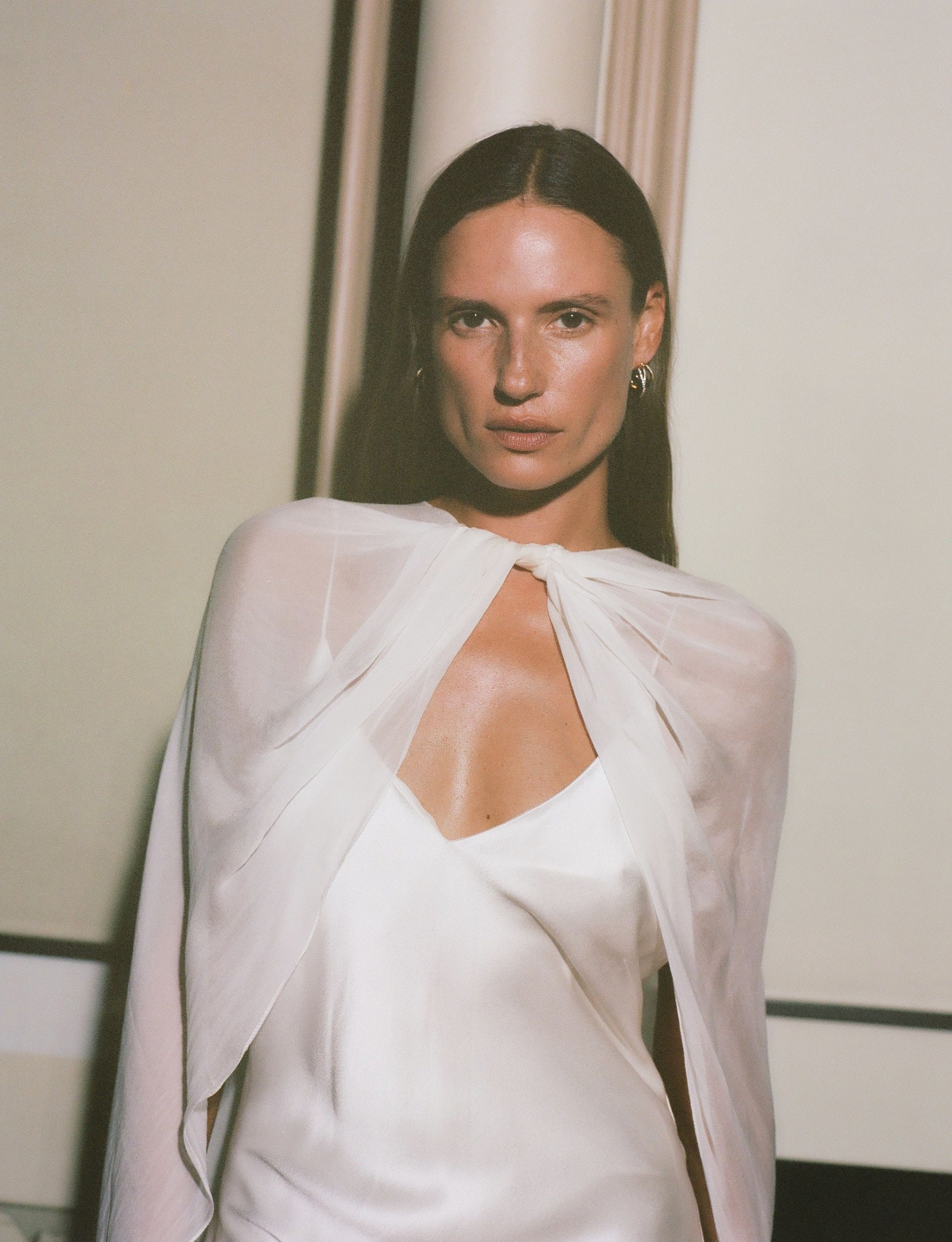 There is a fluidity and ease to this beautiful wedding cape which lends any outfit an almost ethereal quality. Crafted using the softest silk chiffon, this cape can be paired with a number of our pieces including STYLE 039, shown here. Perfect for brides seeking a modern update to the traditional veil. Handmade in London, available in one size.