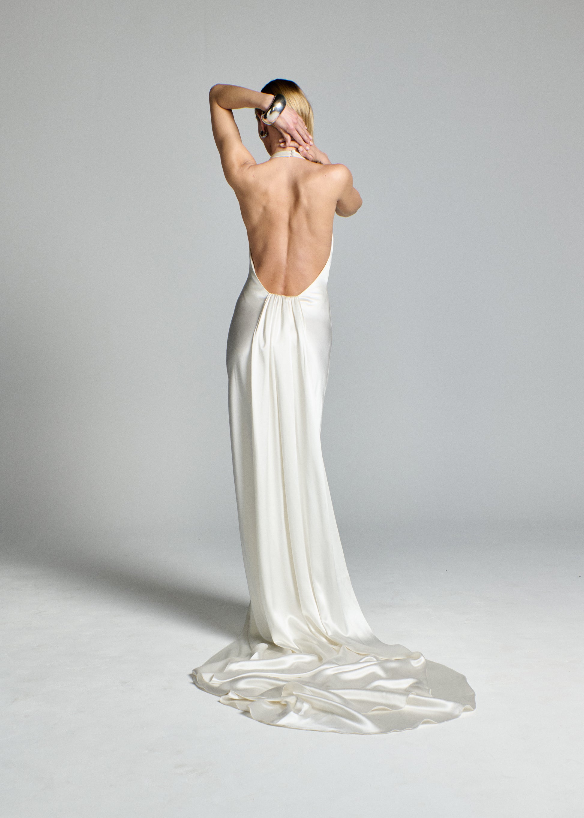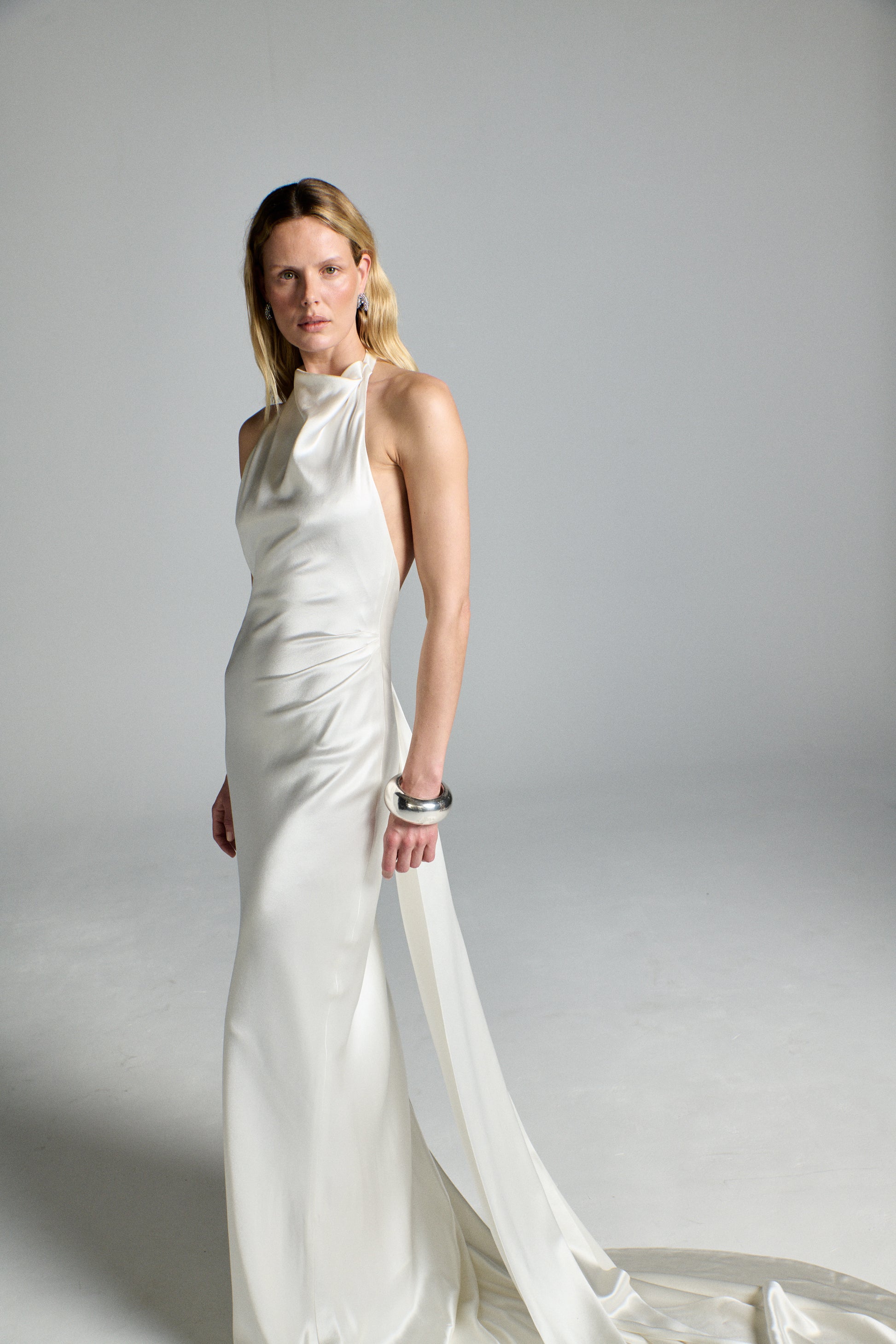 Inspired by our much loved STYLE 029 the super low dramatic back and high soft collar are the stand out features on this stunning halter gown. Fastened with soft covered buttons at the neck, we love how styling it with the STYLE 051 detachable silk satin watteau train creates even more drama on this beautiful piece. The gown is finished with an incredibly dramatic train. Style with a beautiful classic veil.