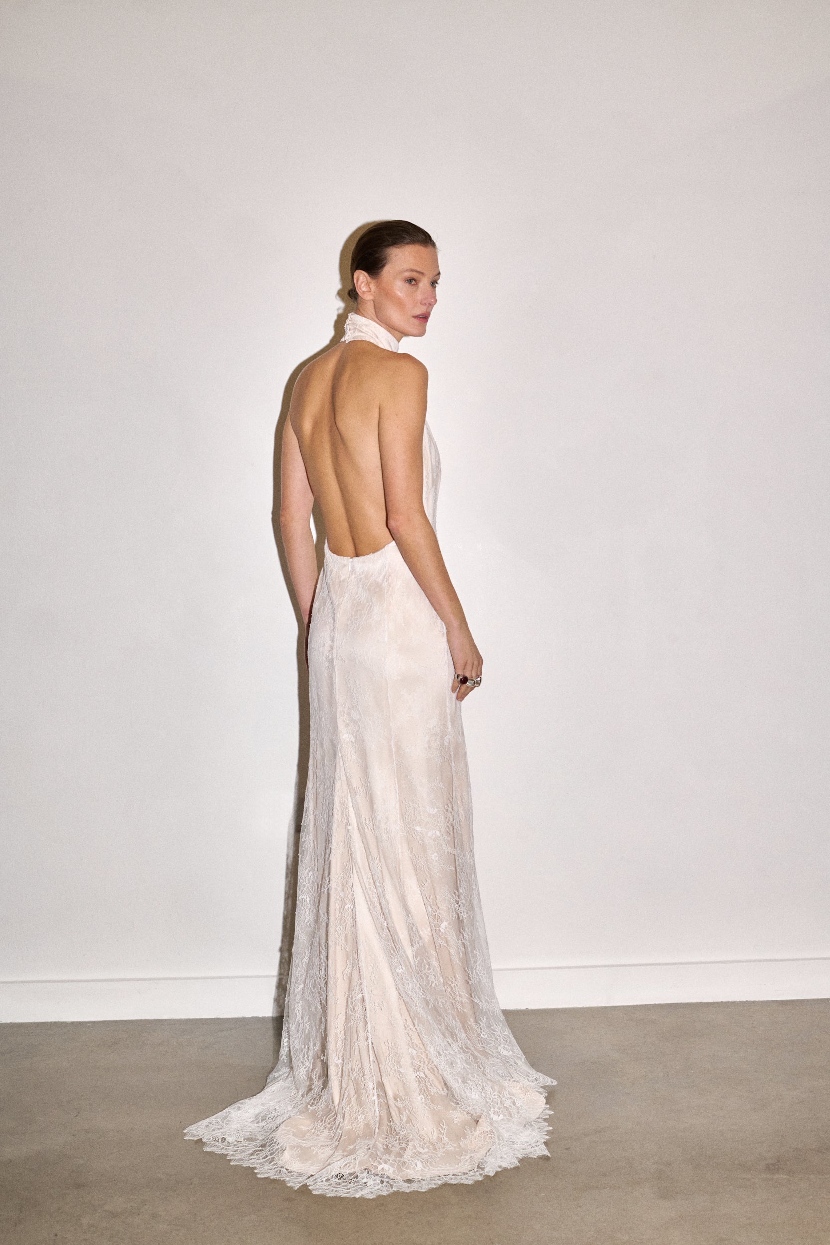 This halterneck gown is crafted from delicate lace and lined with the softest sandwashed silk crepe in a refined greige hue. Scalloped edging traces the hem, highlighting the intricate craftsmanship, while the plunging open back reveals a form-hugging, seamed train that offers a form fitting fit and moves fluidly with every step.