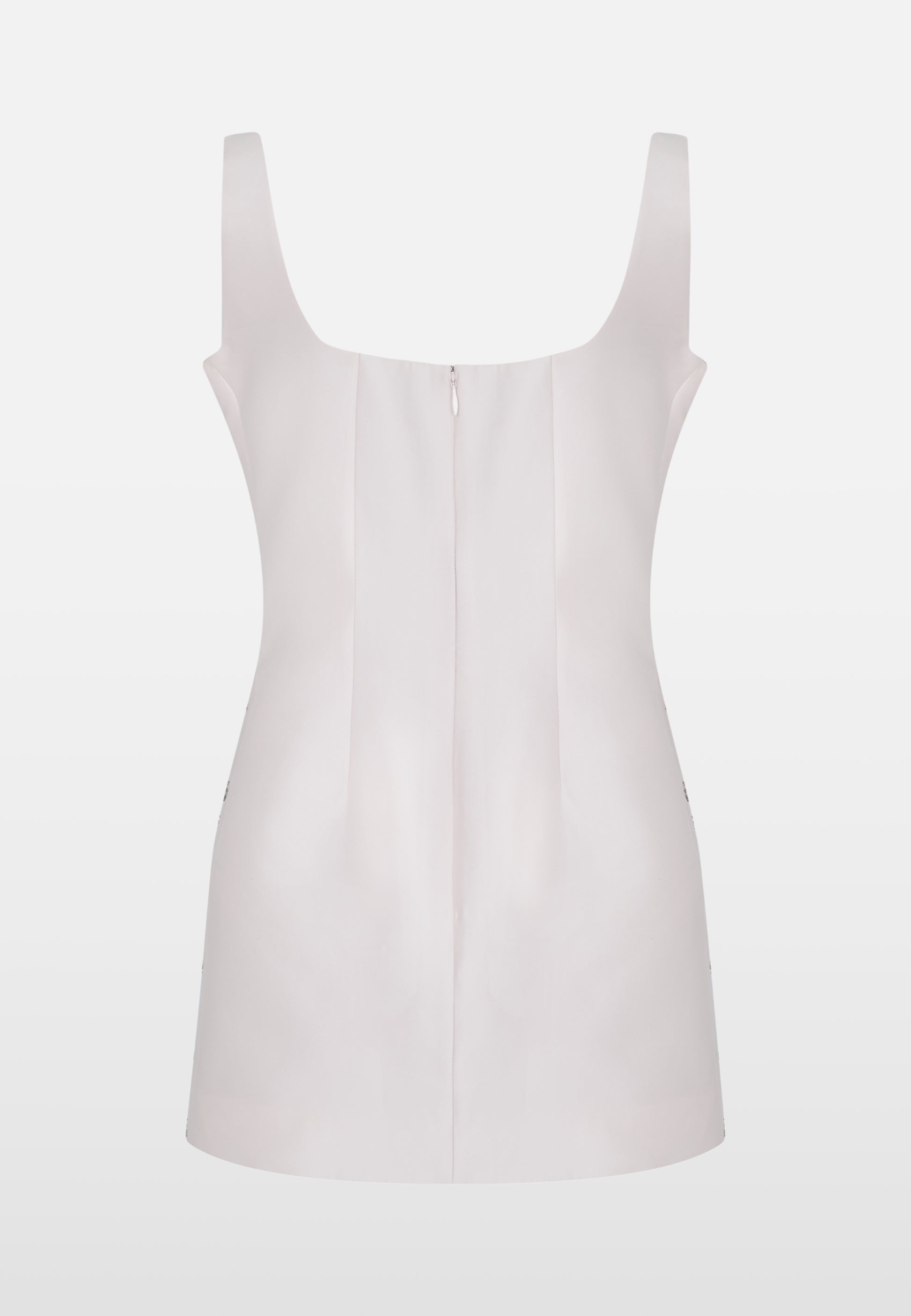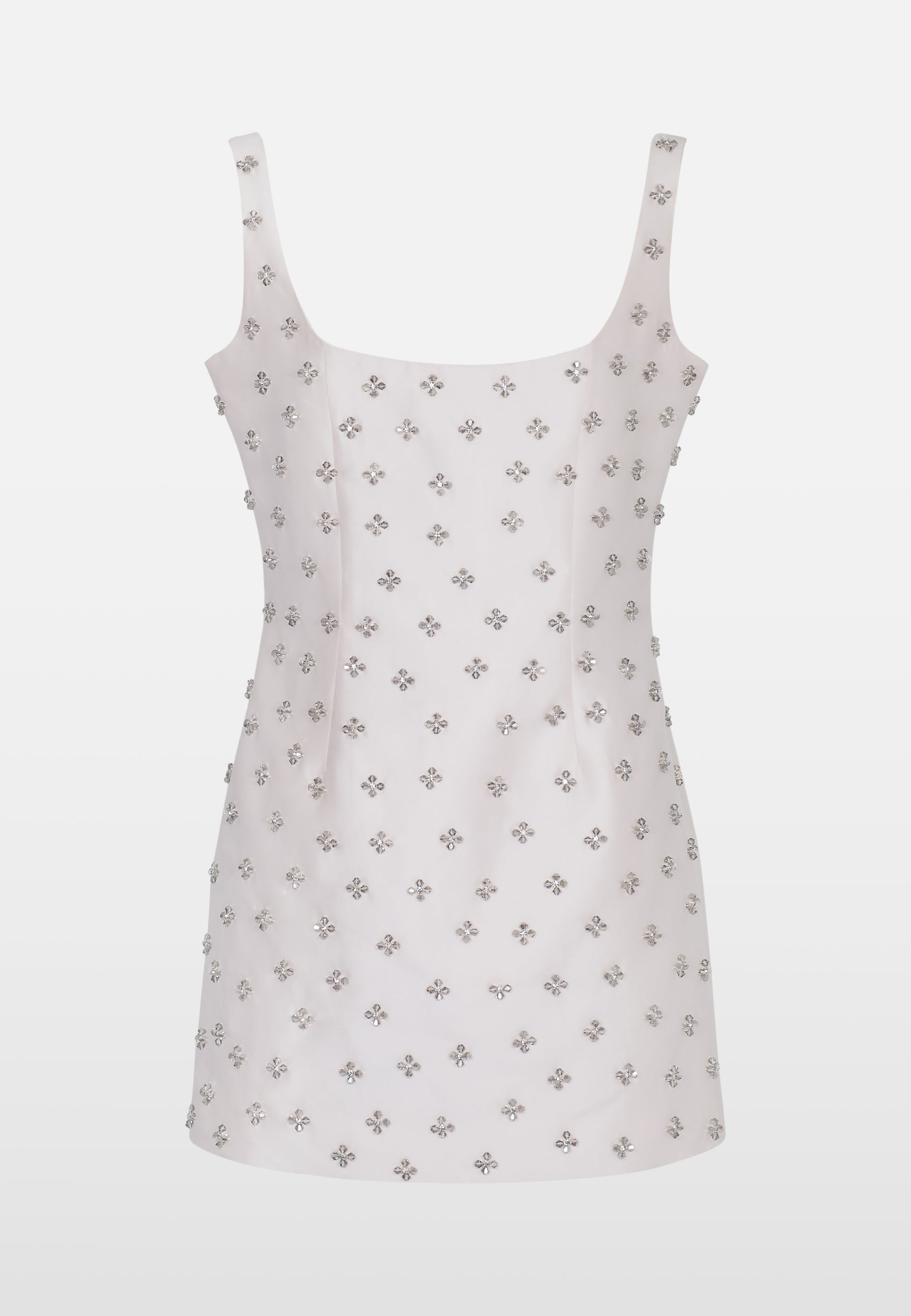 A playful yet refined mini dress cut in soft pink with a flattering square neckline and wide straps. The clean silhouette is brought to life with all-over hand-sewn crystal embellishments that catch the light with subtle sparkle. Designed to skim the body and finish high on the thigh, THE DANCE OR TWO MORE MINI is a piece that feels youthful, modern and unapologetically fun