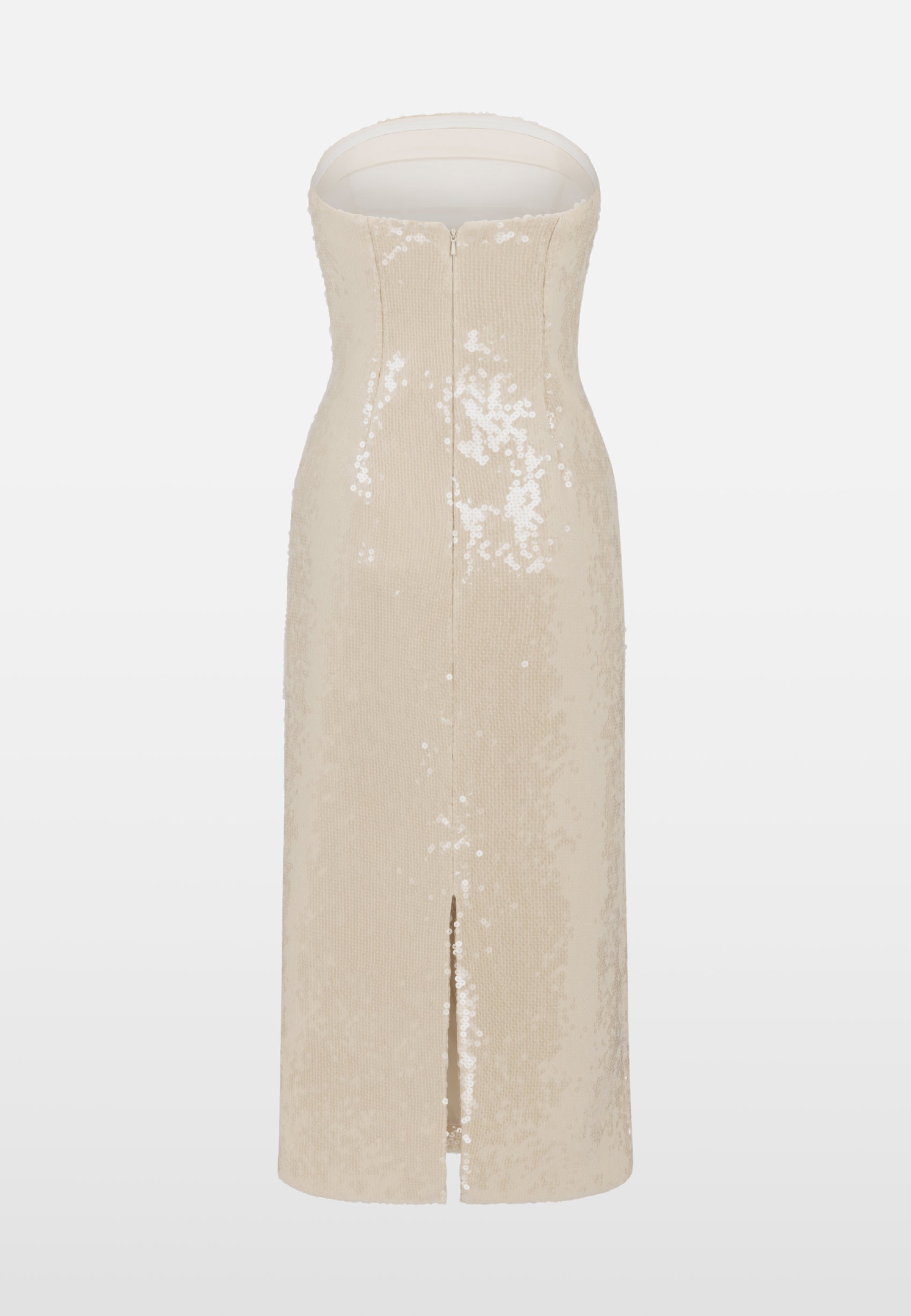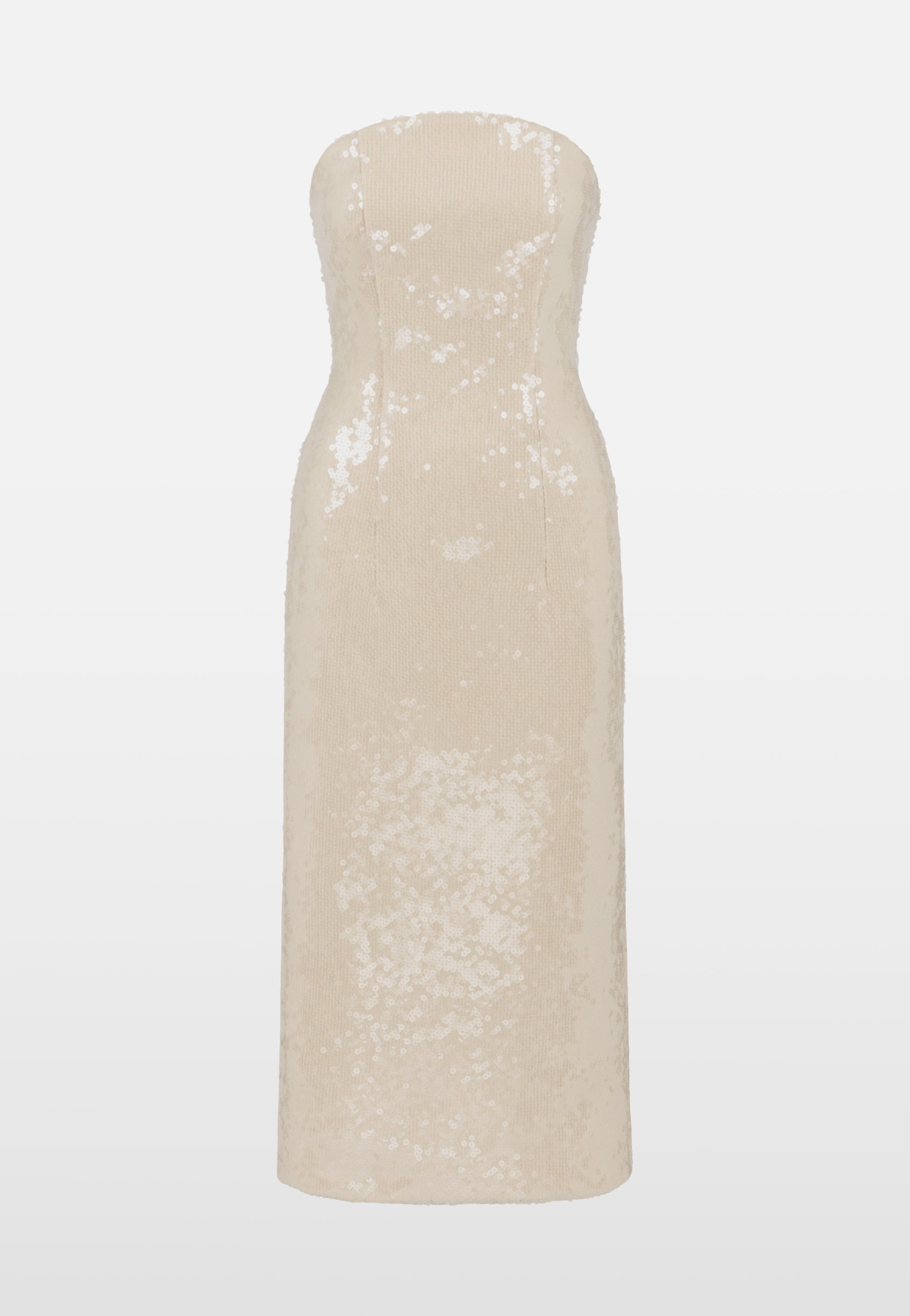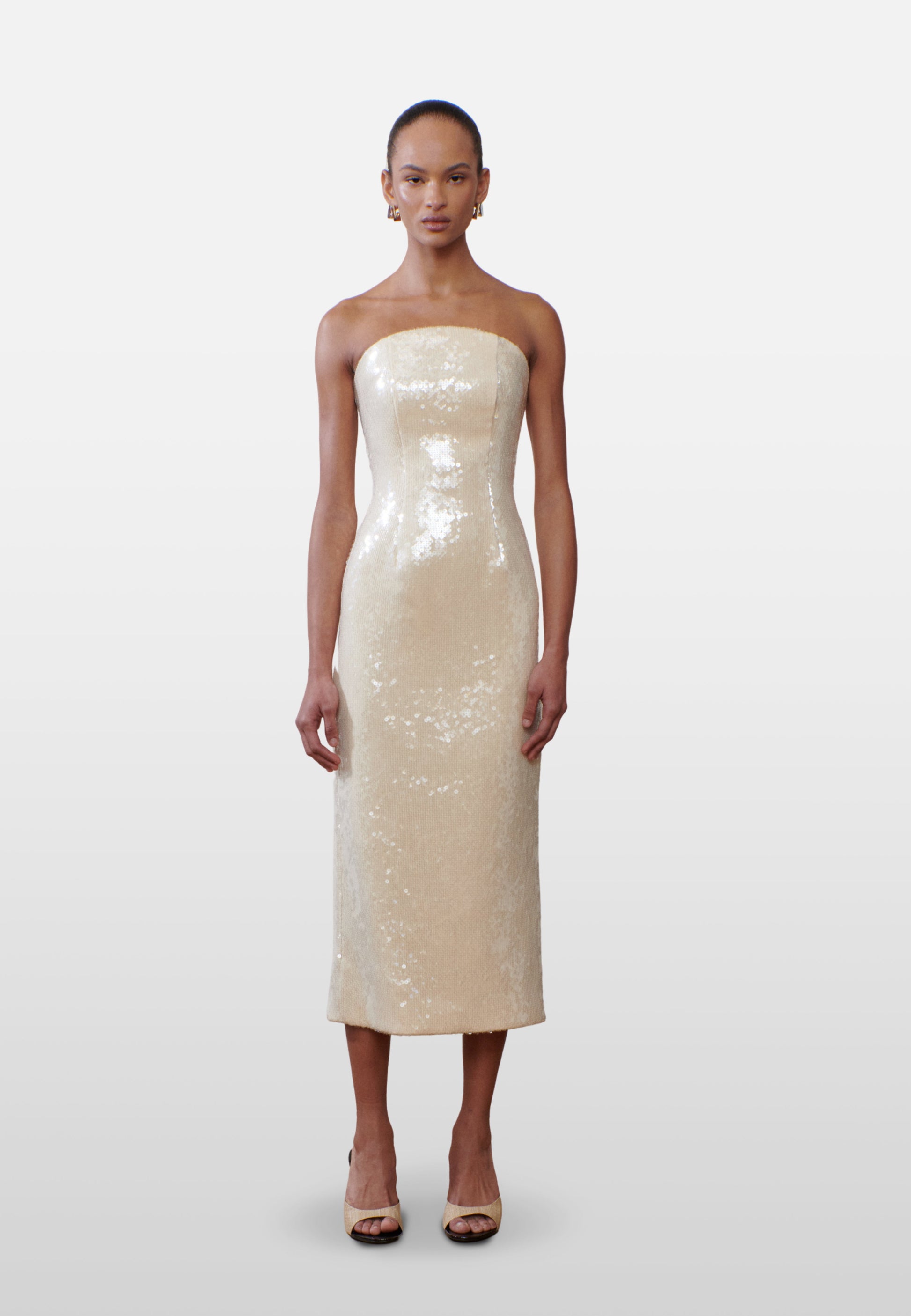 Our favourite signature neckline reimagined in a wonderful nude sequin. The perfect chic party outfit, this strapless column silhouette skims the body beautifully, catching the light with every movement. Effortlessly elegant and modern, it’s a timeless piece designed for statement evenings.
