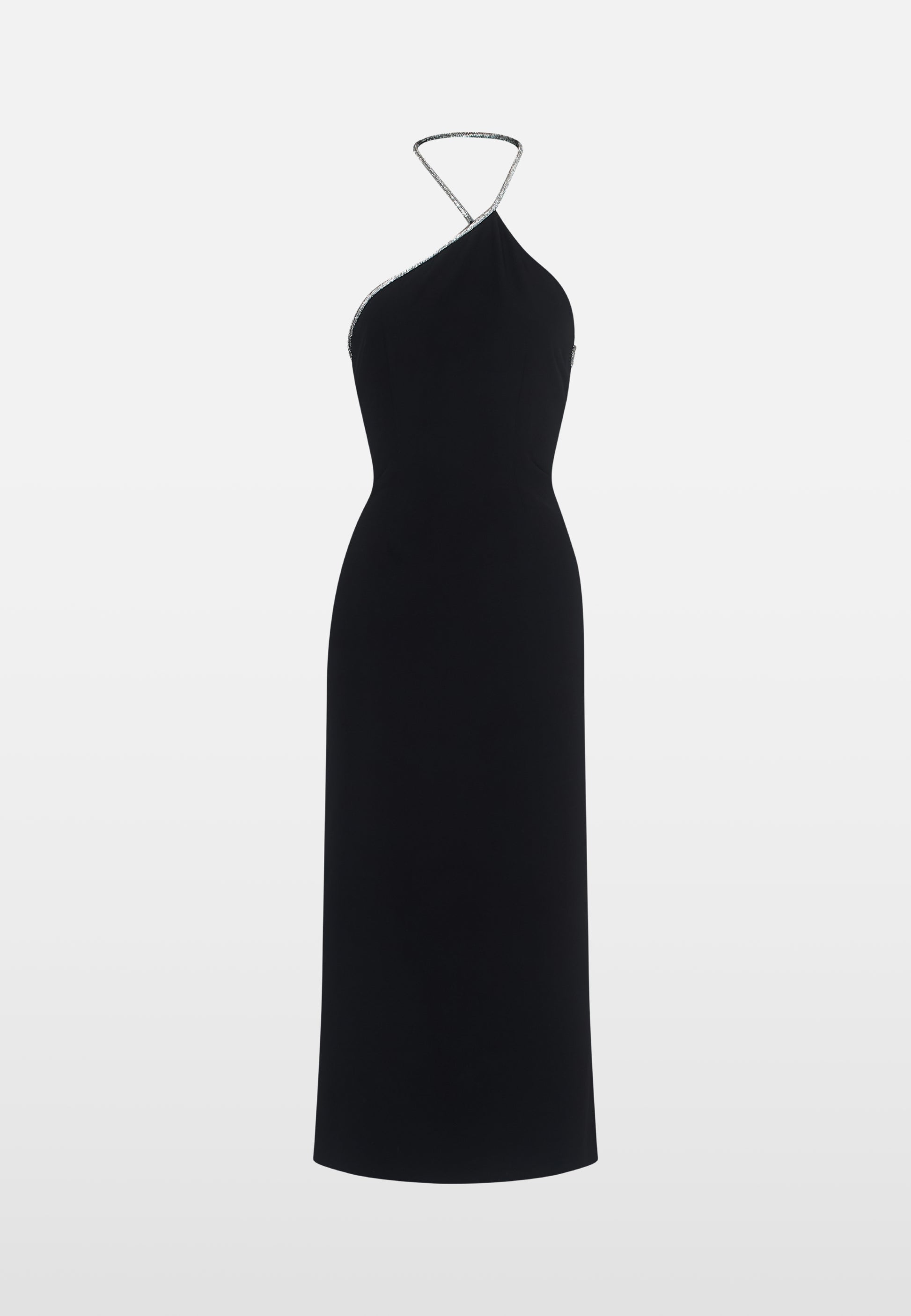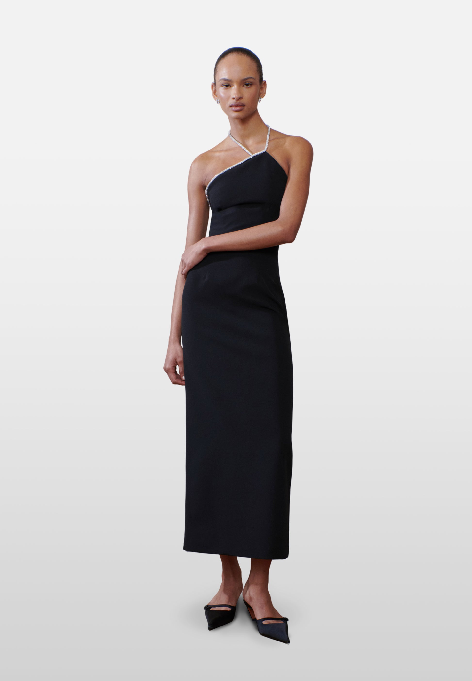 A chic ankle length halter with an asymmetric crystal rope strap.